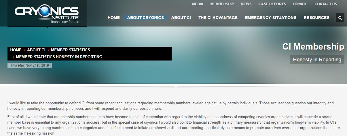 CI官网声明的截图2019年10月底,美国人体冷冻机构“CI” (Cryonics Institute,中文译为“人体冷冻研究所”)在官网公布其总裁Dennis Kowalski关于“会员数据统计诚信度的声明”,并恳切希望世界所有人体冷冻机