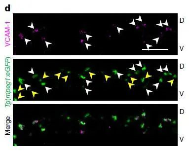 结果发现,如上图,绿色荧光标记了CHT中的巨噬细胞,洋红色荧光标记的是VCAM-1阳性的细胞。可以看到,白色箭头表明所有的VCAM-1+细胞都是CHT中的巨噬细胞,黄色箭头表明,不是所有CHT的巨噬细胞都是VCAM-1+细胞(大概只有45%是VCAM-1+),充分不必要条件。